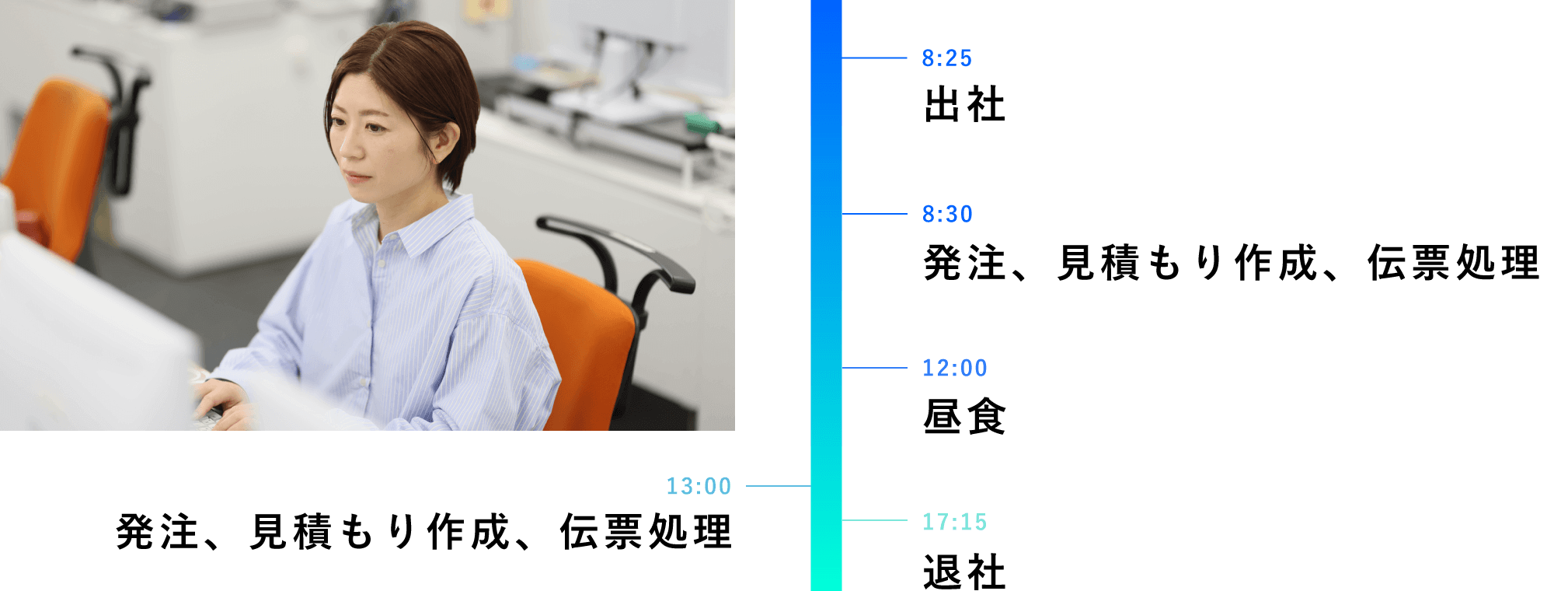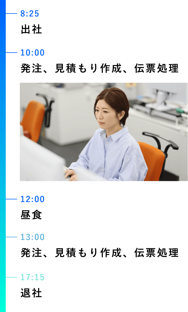 これまで販売の仕事や保育園で働いてきましたが、子どもと過ごす時間を増やしたいと思い事務職への転職を考えていました。ちょうどその頃に出会ったのが辻󠄀さくです。能登半島地震でライフラインの復旧に携わっていたことを知り、「自分も誰かの役に立てる仕事がしたい」という想いから当社を選びました。